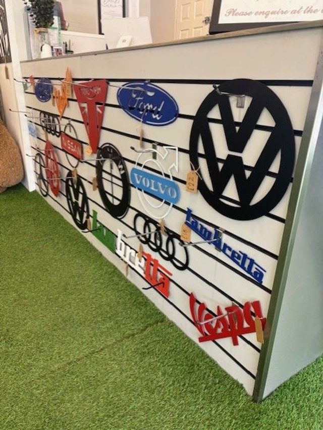 OUR CAR/BIKE LOGOS ADD THAT PERFECT TOUCH TO A MAN CAVE OR A SPECIAL GIFT FOR THAT SOMEONE SPECIAL. IF YOU DONT SEE THE LOGO YOU WANT, DONT WORRY, WE CAN DO ANY LOGO IN ANY COLOUR.
